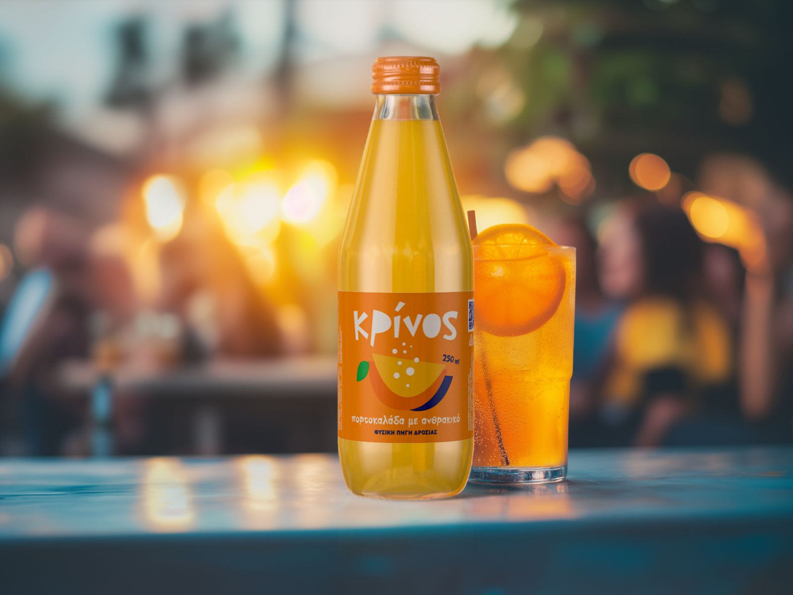 KRINOS Carbonated Orangeade stands out with its playful orange label and orange flavor-lock cap. Its minimalist visual style reflects a distinctly Greek character.