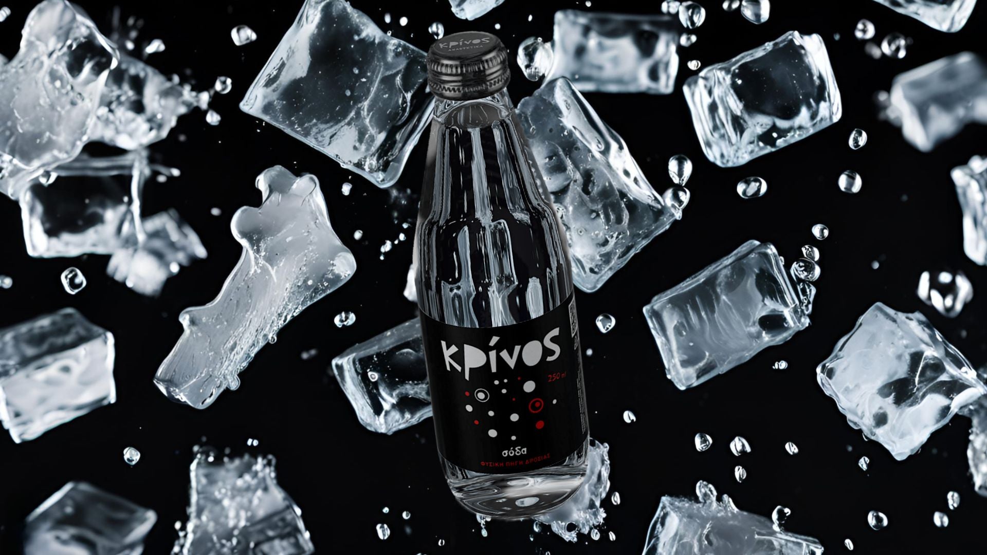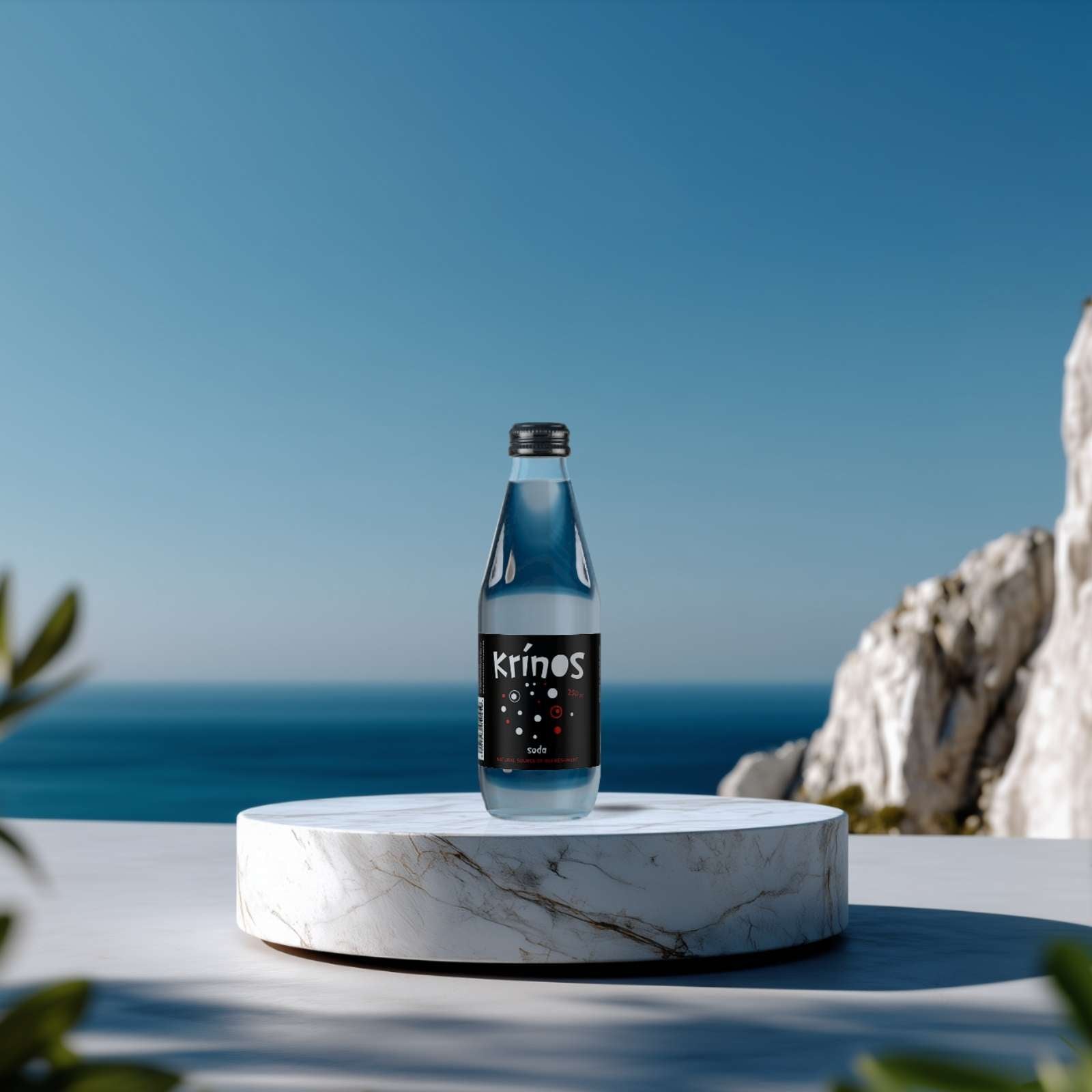 KRINOS Soda stands out thanks to its modern black label, accented with red and white touches, and its black flavor-lock cap. Its minimalistic, purely Greek design captures the joy of bubbles.